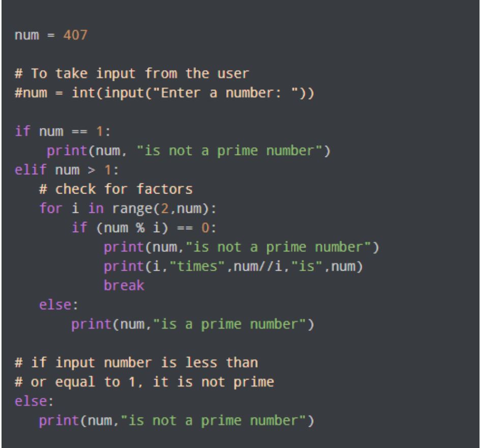 Consider this example of a Python program. It uses the “for…else” statement for checking whether a number is a prime number or not.
