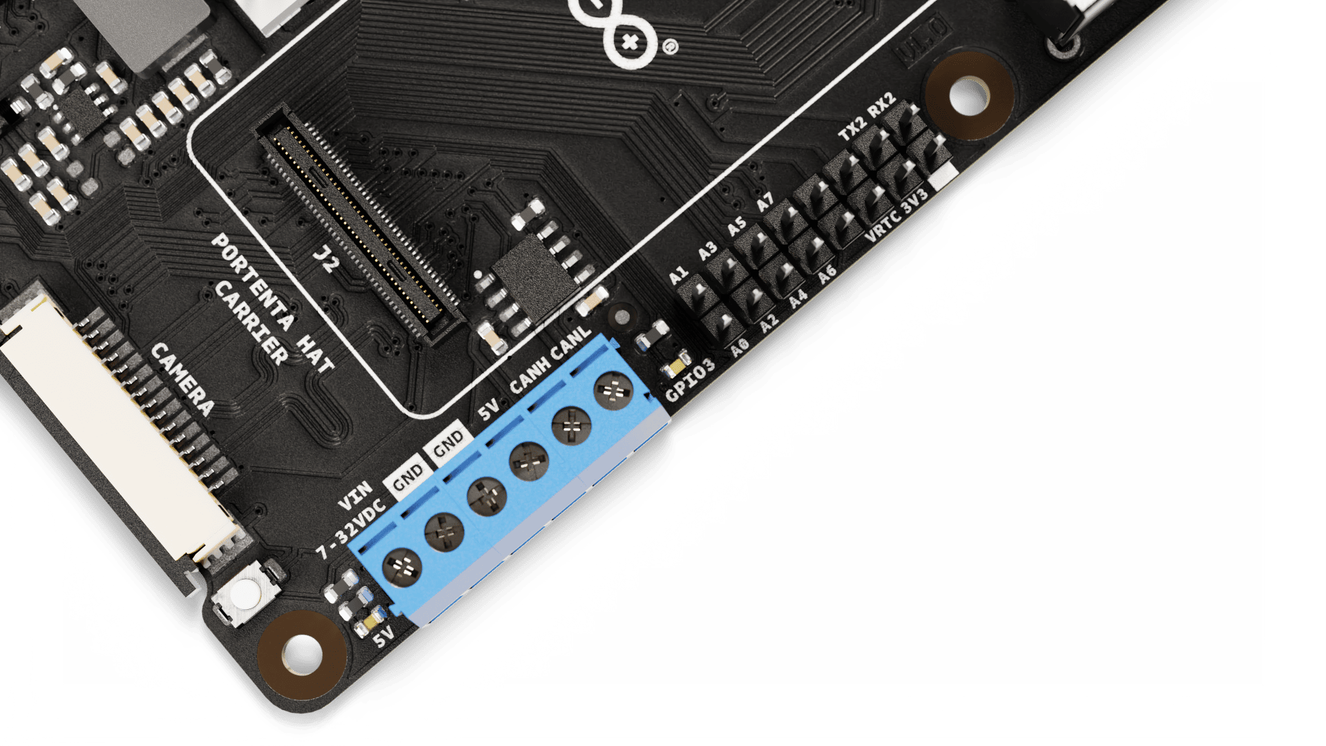Compatible also with Portenta H7 and Portenta C33, Portenta Hat Carrier provides easy access to multiple peripherals – including CAN, Ethernet, microSD and USB – and further simplifies any Portenta application.