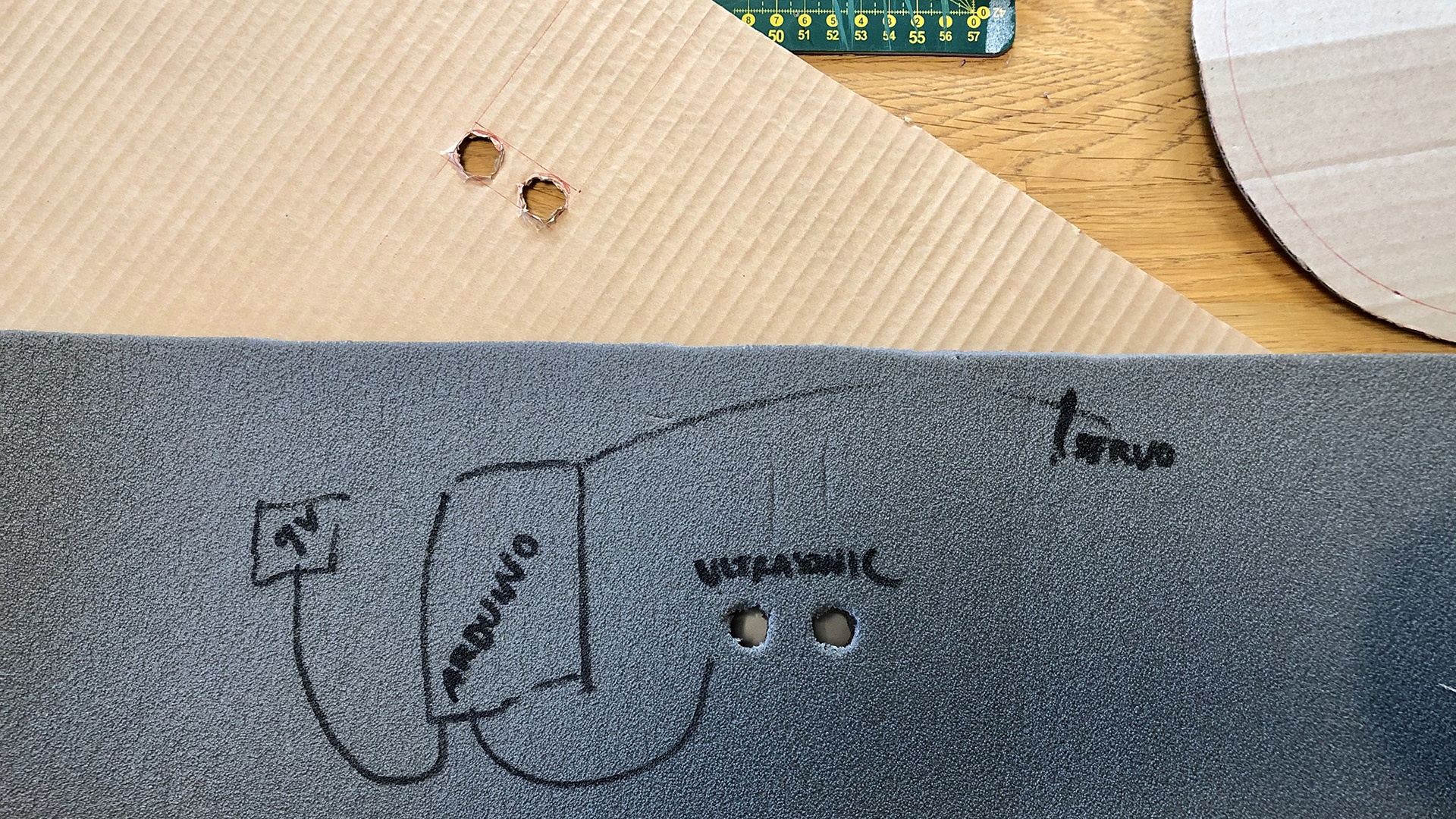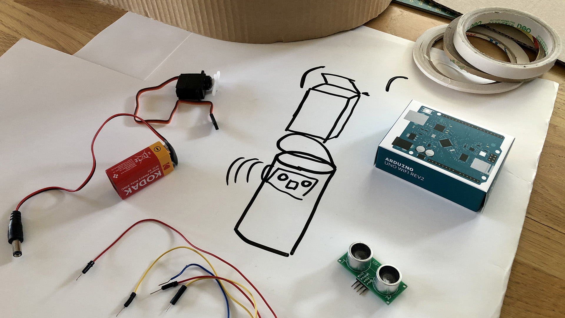 You can design your own trash can for this project. In our project, we used cardboard and a piece of a grey foam mattress. To the side of the trash can create holes for the ultrasonic sensor and attach the servo’s shaft to the lid. You can power the Arduino board with a battery to create a wireless project. In the picture below, is our plan and where we connected the different components.