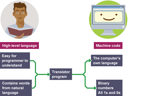 Machine level languages use machine-specific syntaxes, codes, and binary numbers. This illustration shows the difference between high-level languages and machine code.