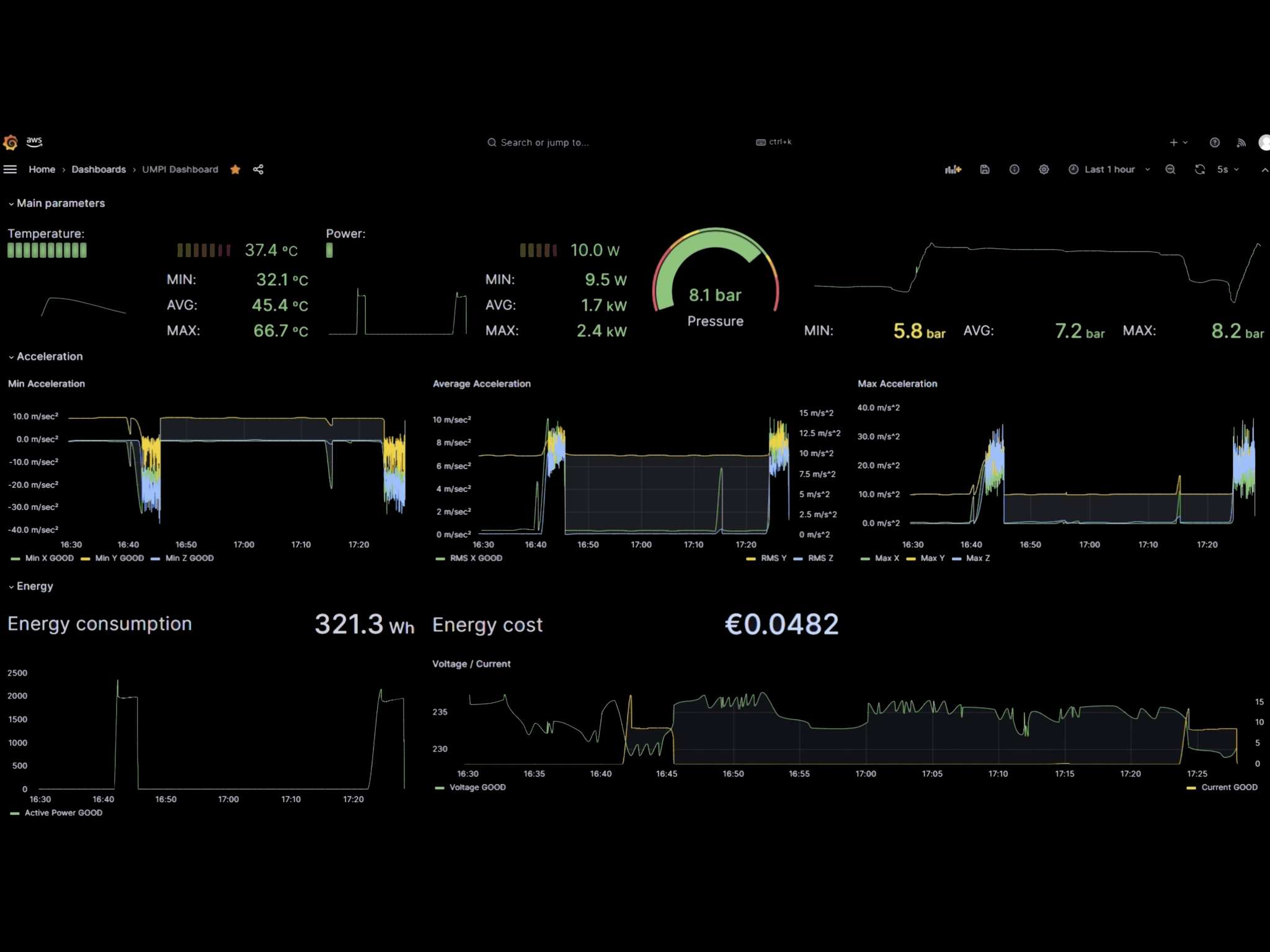 Air compressor temperature, vibration, energy consumption and pressure data are detected via sensors and sent to the Cloud, where they are stored using AWS, to be visualized in real time thanks to Grafana. With its Modbus RTU and TCP/RS485/I2C, thermocouple input and many analog and digital I/Os, Portenta Machine Control was the key to make this system compact and cost-effective. The onboard connectivity avoided long, bulky cables, and DIN-rail compatibility made installation effortless.